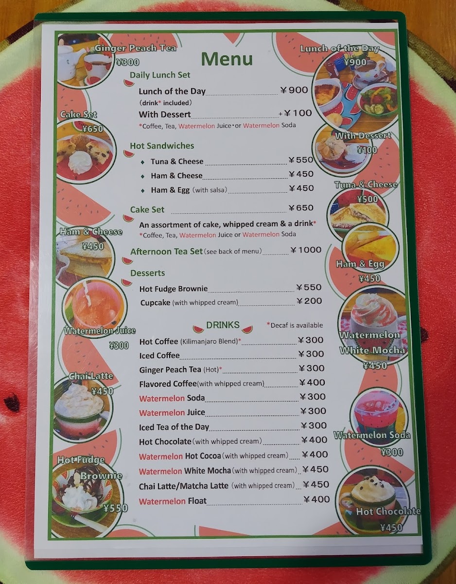 Your beverage experience is equally enticing with choices like the aromatic Hot Coffee (Kilimanjaro Blend) or Iced Coffee, both available for just JP¥300. For something a bit different, try the refreshing Watermelon Juice or Watermelon Soda to keep you cool on hot days. If you crave a touch of sweetness, the Watermelon Hot Cocoa and Watermelon White Mocha (JP¥450) are delightful companions bursting with flavor, particularly adored by the visitors.